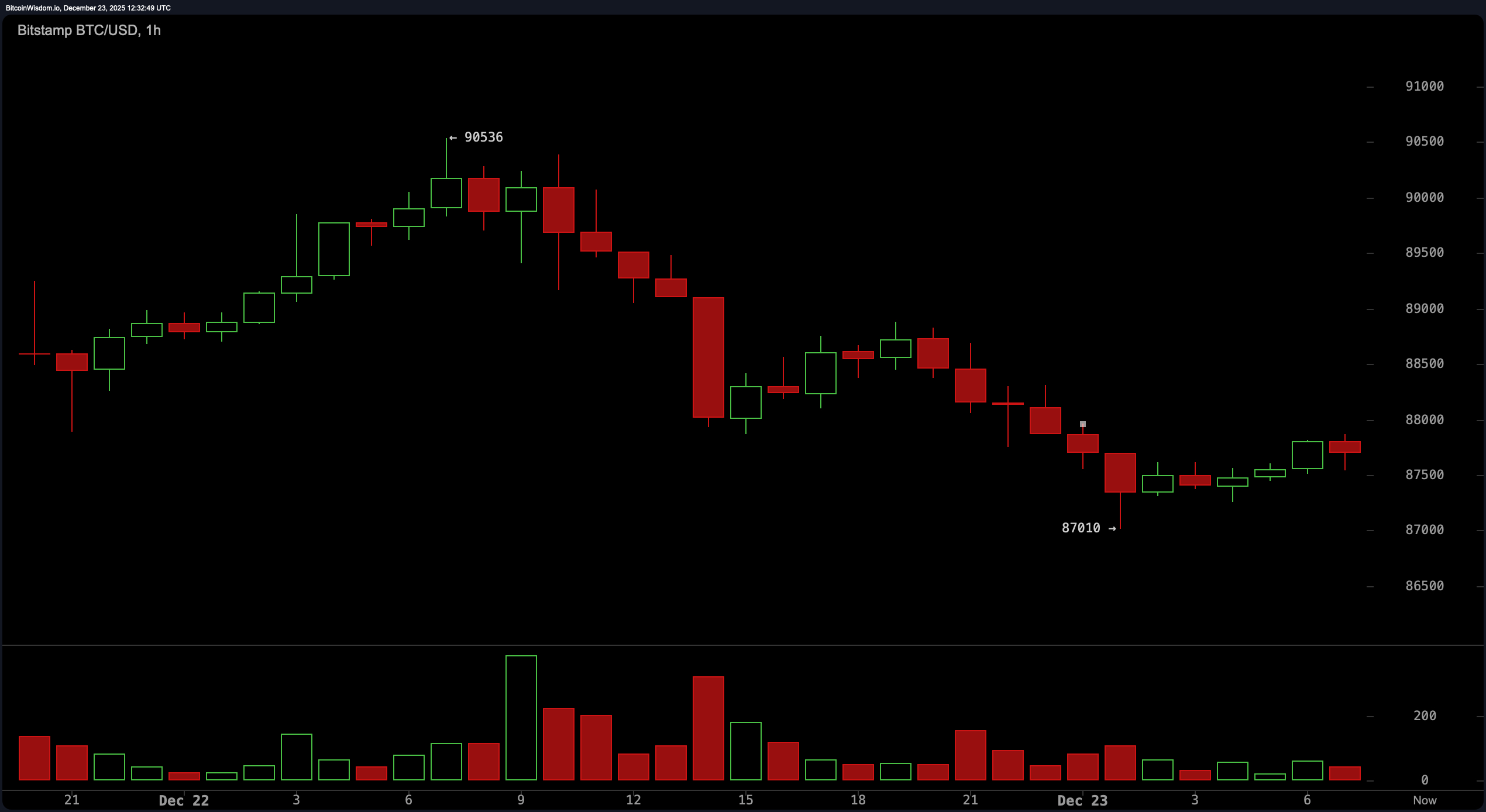 Zooming into the 1-hour chart, signs of life begin to twitch. After bouncing off $87,010, bitcoin has started forming higher lows, hinting at the early stages of a base — but don’t pop the champagne just yet. Momentum remains limp, though improving, as cautious buyers step back in like introverts at a networking event. Immediate support lies between $87,000 and $87,300, with resistance parked at $88,500 and $89,200. This timeframe suggests a short-term recovery attempt, but until bitcoin clears overhead levels with purpose, the bulls remain on probation.