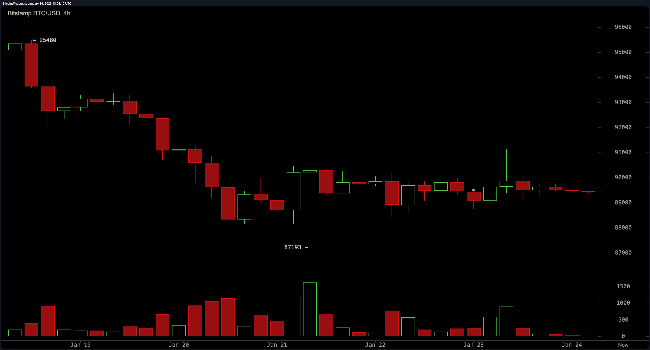The 4-hour chart reinforces the same cautious optimism—think of it as bitcoin quietly sipping coffee, contemplating its next big move. The descent from $95,480 to $87,193 has mellowed into sideways action, trading in tight candles with subdued volume. A minor spike near January 23–24 hints at interest, but it’s far from a decisive push. The sweet spot to watch? A confirmed breakout above $90,500 could nudge the door open to a short-term uptrend. But without volume stepping up to the mic, any breakout attempt might fall flat.