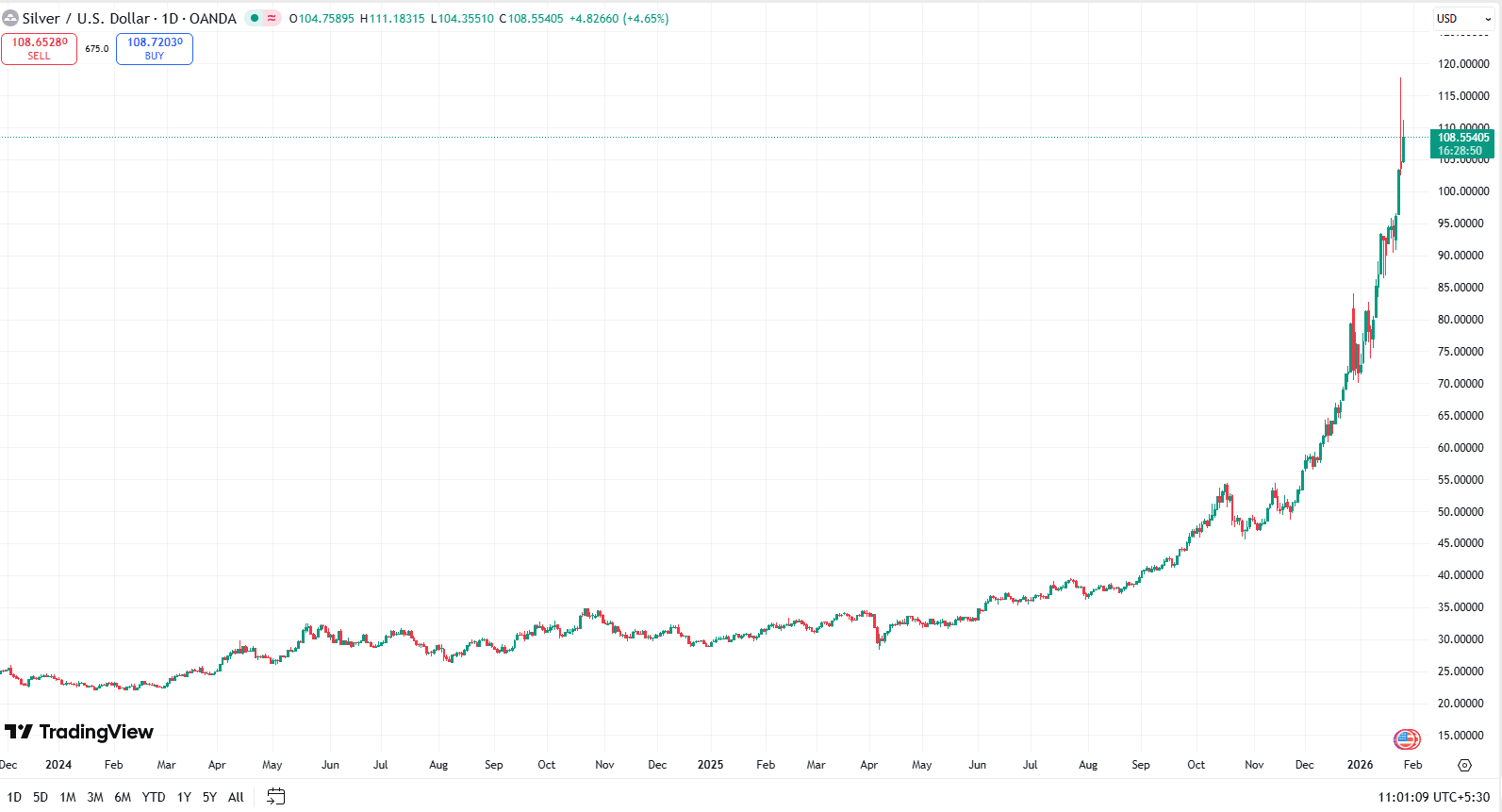 Silver closed at $48.68 per ounce on October 31, 2025. By late January 2026, it had crossed the psychological $100 threshold, currently trading near $110 per ounce after establishing session highs above $109. This 104% surge in three months added approximately $2.83 trillion to silver's total market value.