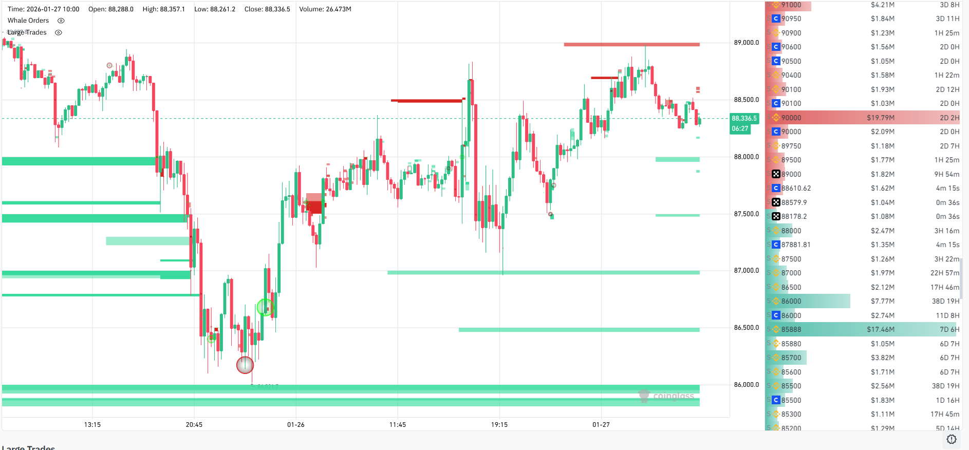 Whale orders have returned to BTC, but are currently protecting a price floor around $86,000 to $87,000. Above $90,000, price pressure is returning with a big sell wall.