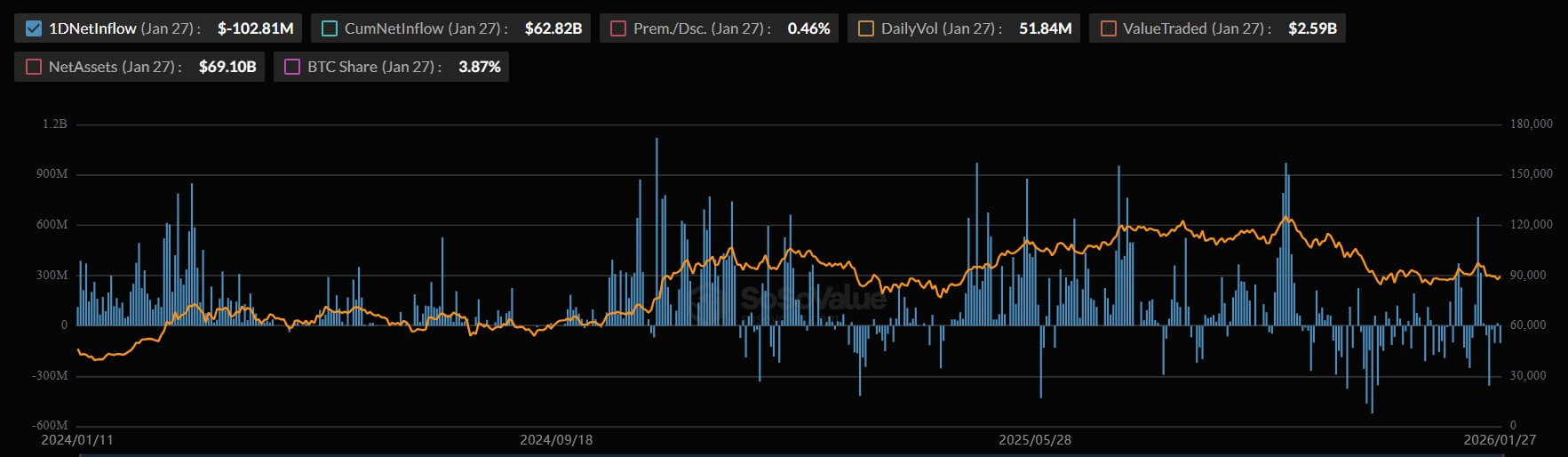 IBIT is already the largest Bitcoin ETF by assets, with roughly $69.2 billion in net assets as of Jan. 27, 2026, according to BlackRock’s fund data. Moreover, flow data compiled by SoSo Value shows cumulative net flows of $62.816 billion into IBIT.