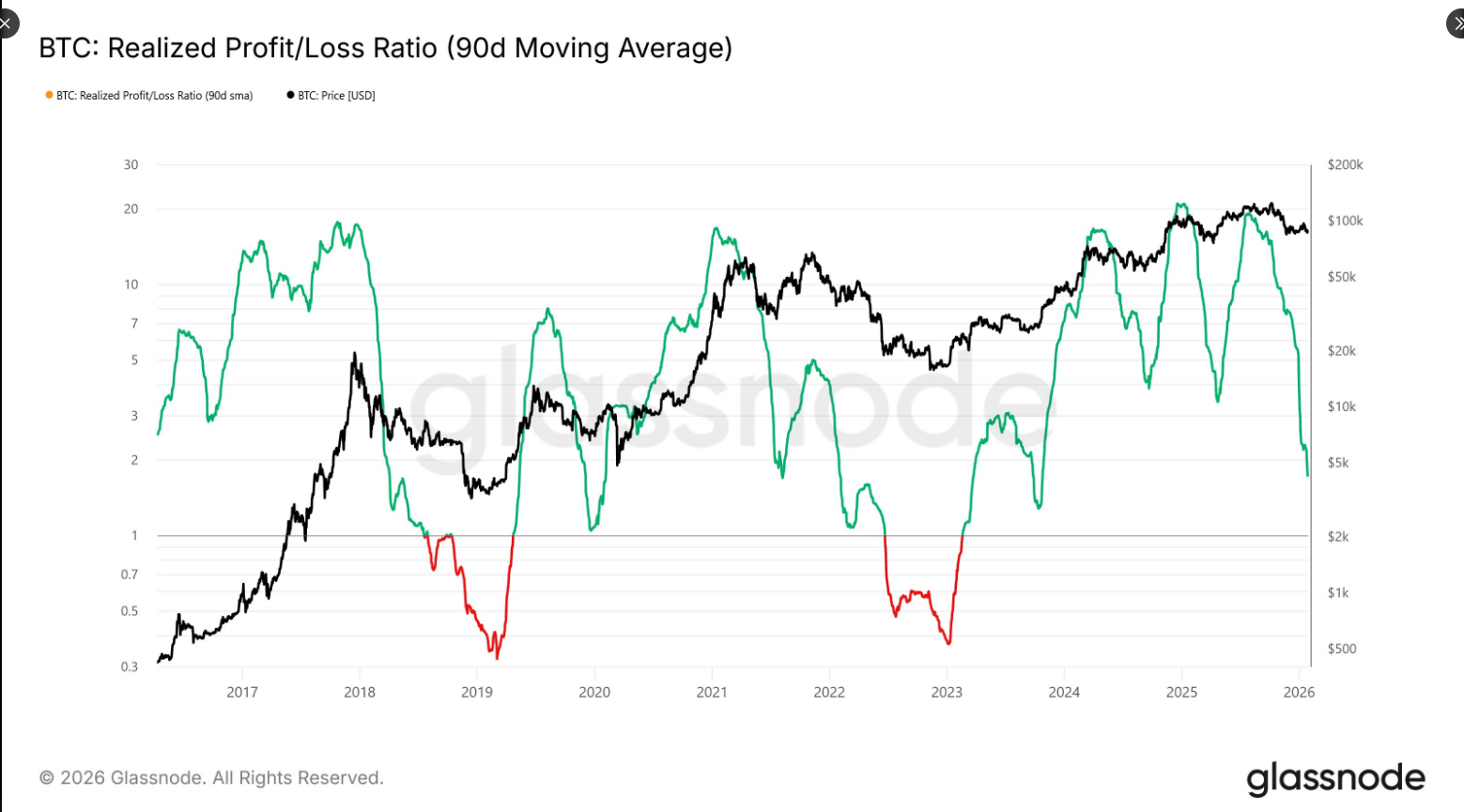 Reports note that any move toward a lasting rally would need to show up in liquidity-based signals, with close attention on the 90-day moving average of the realized profit and loss ratio.