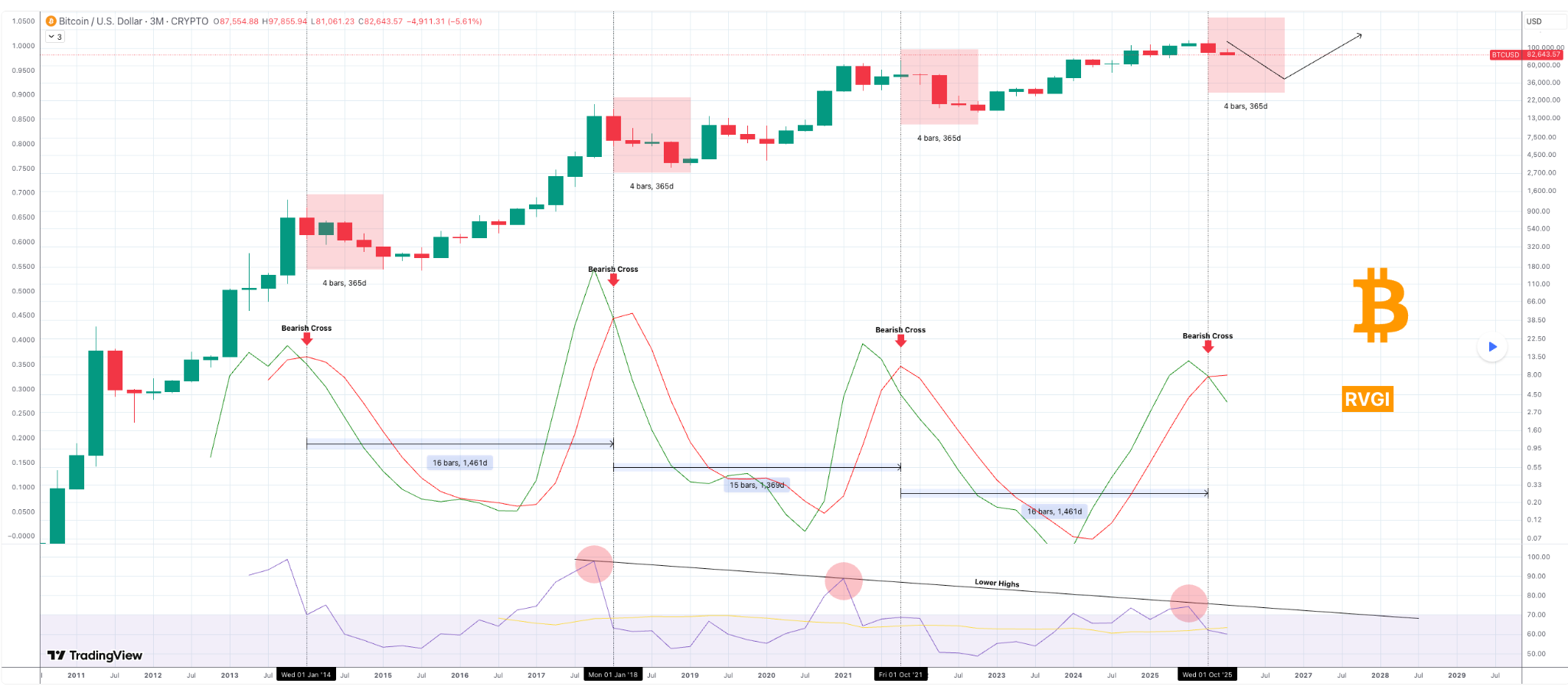 Historical data also shows a clear rhythm, with RVGI bearish crosses occurring roughly every 15 to 16 quarters, in line with Bitcoin’s four-year cycle.
