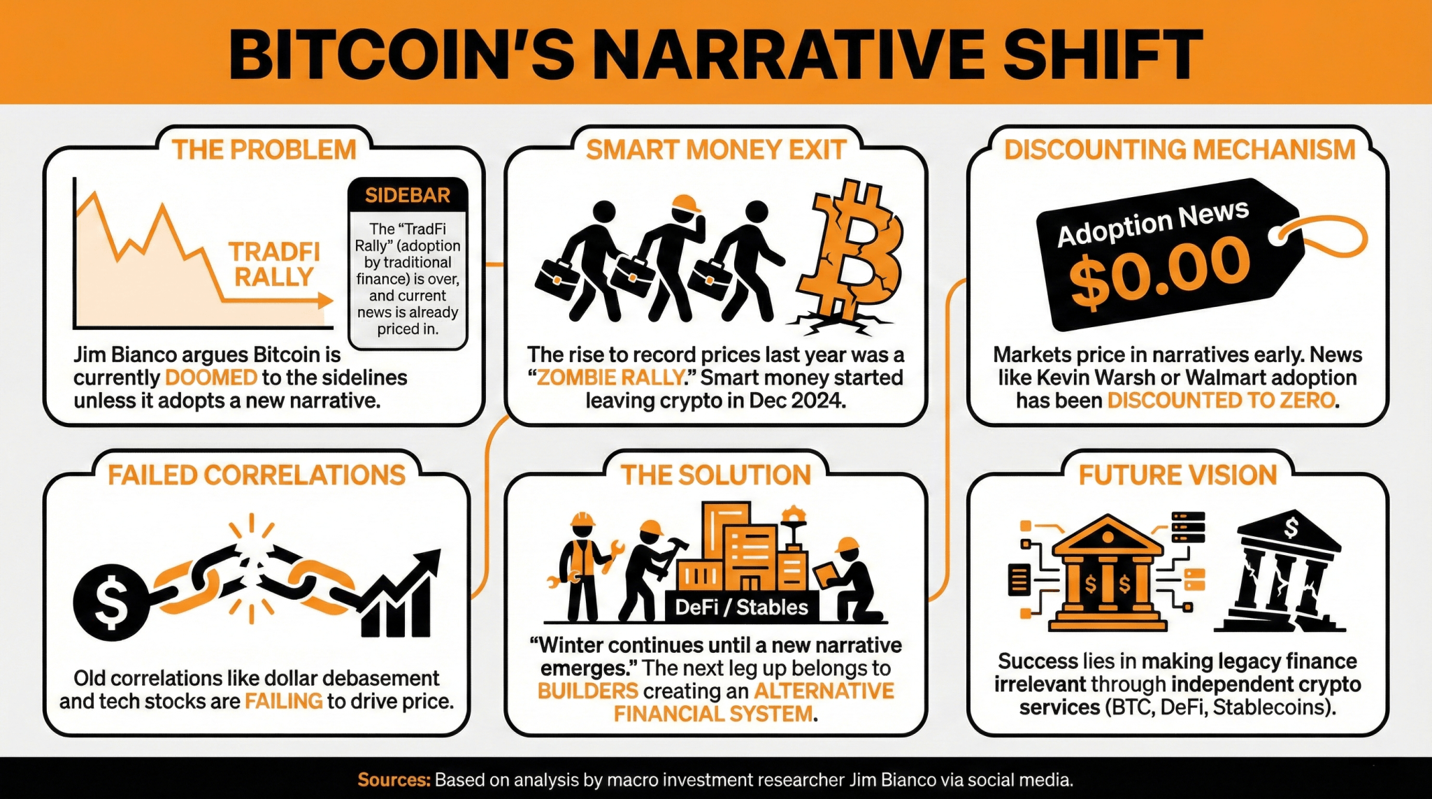 He asserts that a new narrative, focusing on independent crypto services and alternative financial systems, is essential for bitcoin to break out of its downtrend.
