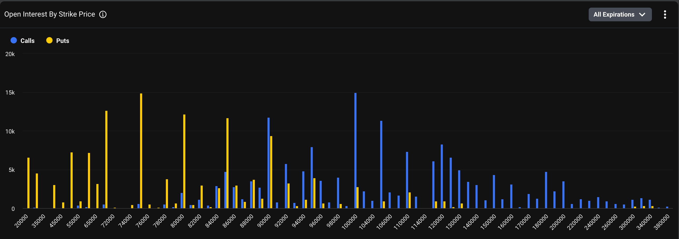 While the $75,000 put is the most popular bearish play, significant open interest is also seen in puts at strikes of $70,000, $80,000, and $85,000, whereas higher-strike calls, except the one at $100,000, lack similar activity.
