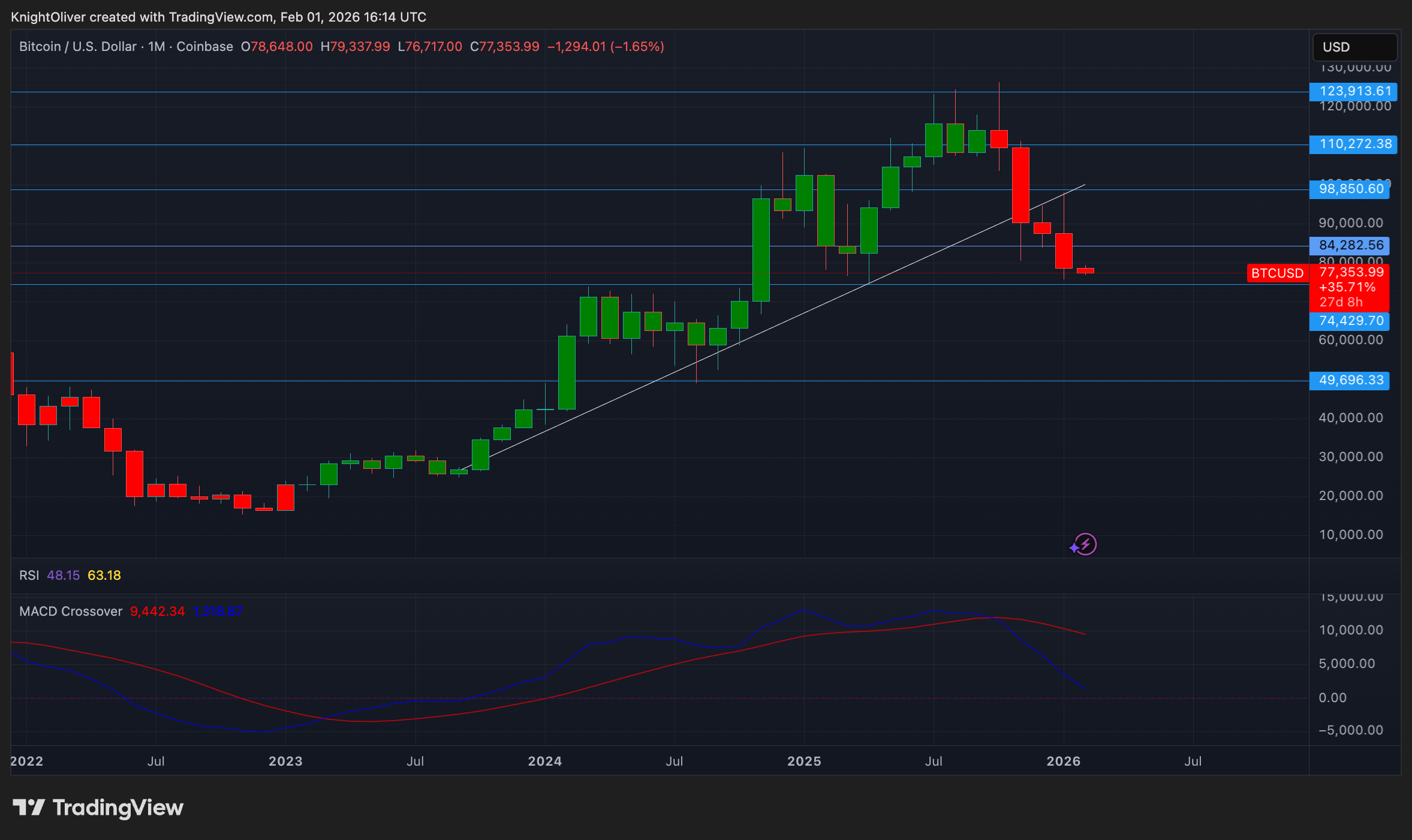 The monthly MACD — a technical trading indicator — crossed down in November, a rare signal that has preceded extended downturns in previous cycles.