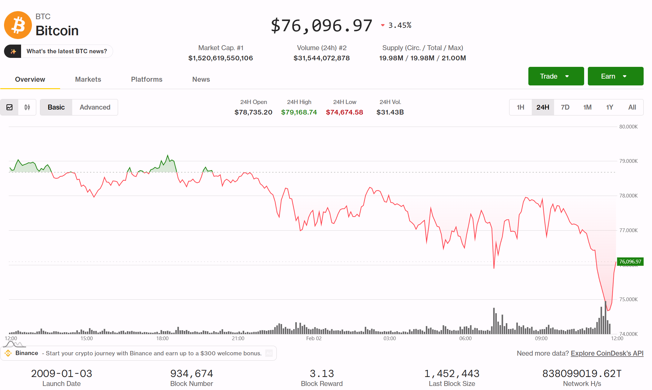 Bitcoin $BTC$75,578.49 traded back above $76,000 after a short-lived break of support, where it tested $74,000, highlighting the fragile balance between dip buyers and forced sellers in a market still short on "depth."