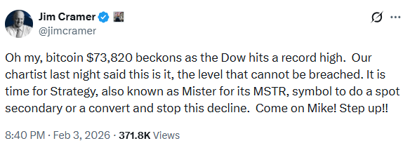 “Memo to Michael Saylor: we think that $73,802 is the line in the sand for bitcoin,” Cramer posted. “Time to do another zero-coupon convert and stop this decline. Strategy’s earnings depend upon it and what will you talk about when you report Thursday? Let’s get this done!”