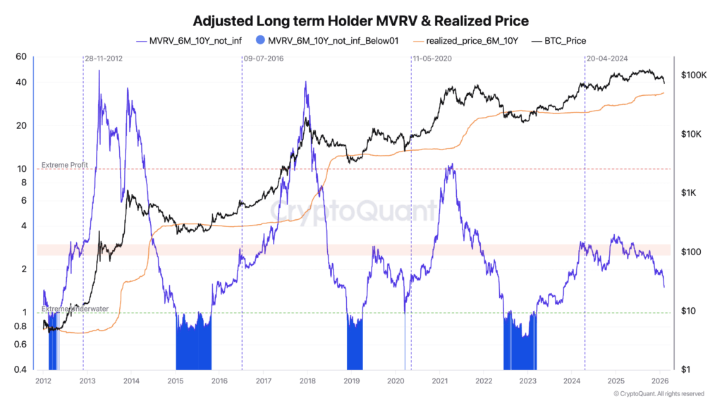 When that adjusted long-term holder MVRV drops below 1.0, it means the cohort is underwater on average.