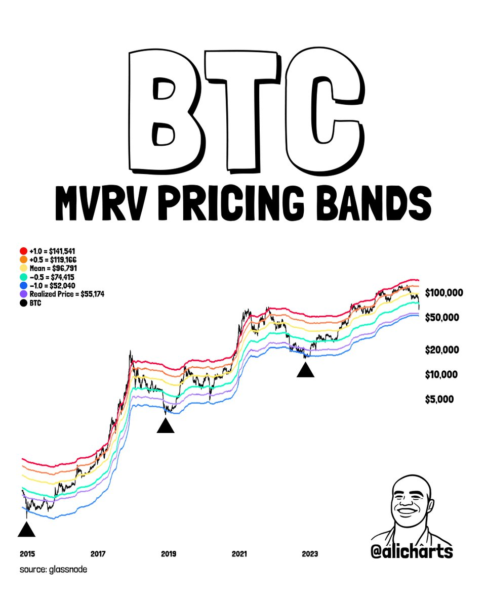 This pattern was visible during the 2015 bear market, the 2018 crypto winter, and again in 2022, each time preceding multi-month recoveries. The −1.0 band currently sits around $52,040, placing Bitcoin within a historically significant accumulation range rather than a typical correction zone.