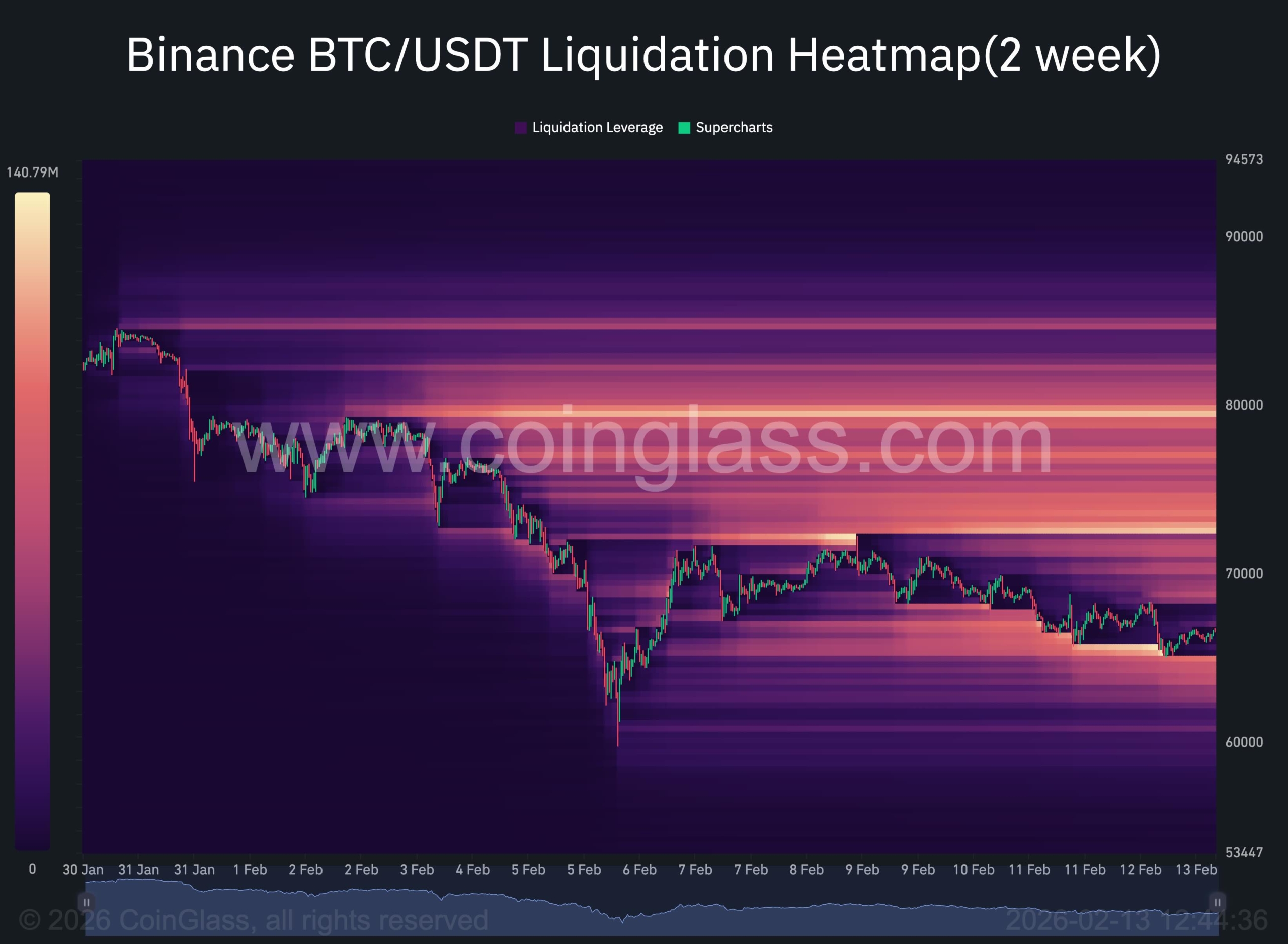 A breakout above the intermediate $72K resistance could accelerate price toward this zone, potentially triggering a short squeeze if $80K is reclaimed. On the downside, liquidity remains relatively thin until the $60K–$62K region, which aligns with the recent swing low.