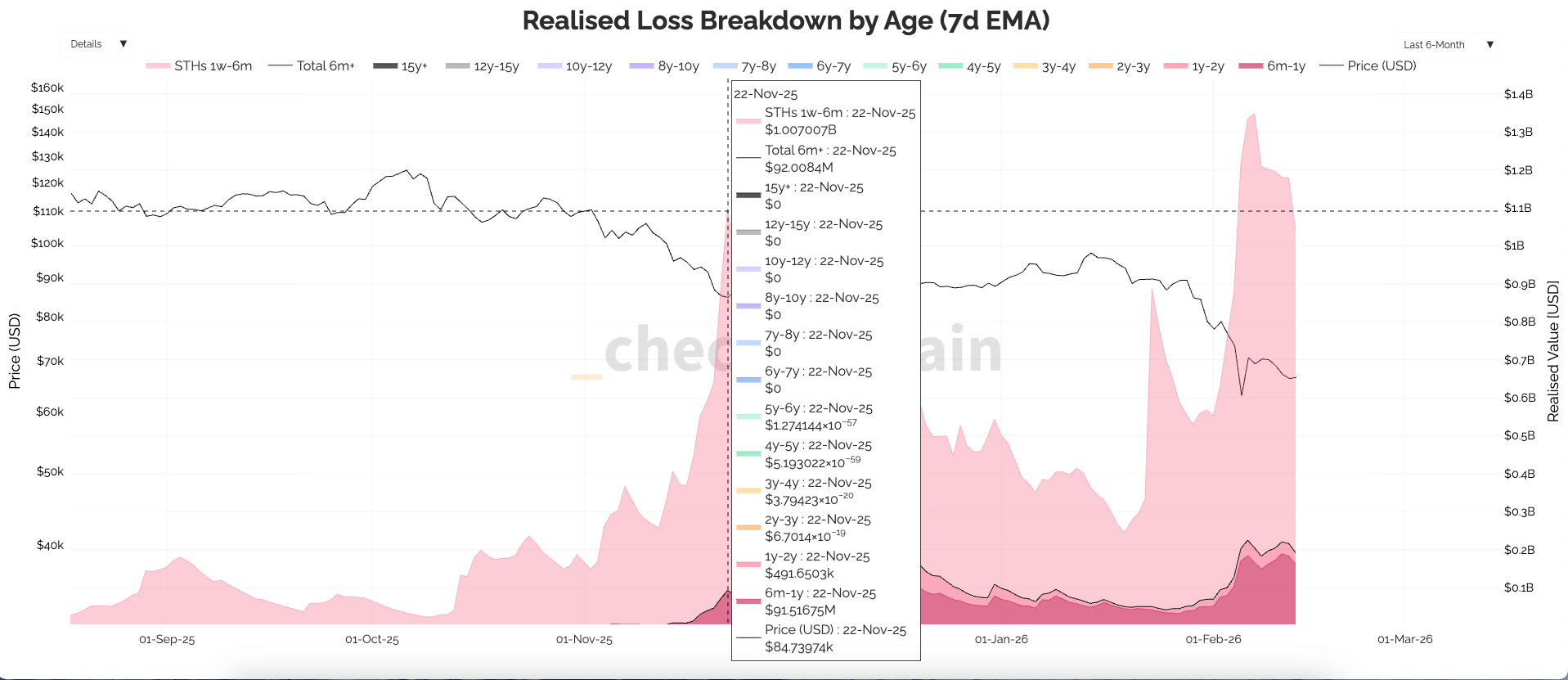 When we net losses against profit-taking, the net realized loss rate was around $1.5 billion per day during the heaviest window. When focusing only on realized losses, we can treat November 2025 and February 2026 as separate capitulation events that each exceeded $2 billion per day in realized loss.