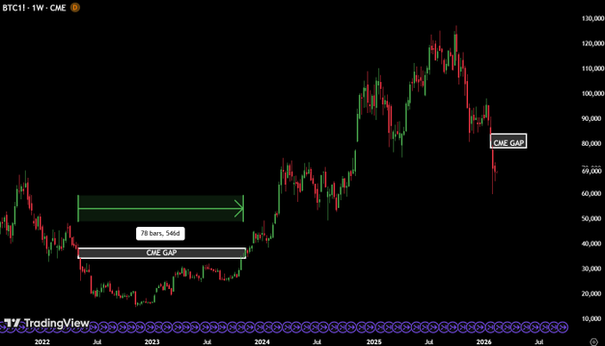 According to his analysis, Bitcoin’s recent pullback has left a CME futures gap near $84,000. With Bitcoin currently trading at $68,372, the market would need to rally approximately 22.85% to close the gap. Historically, Bitcoin has typically filled most CME gaps within days. However, rare exceptions do exist.