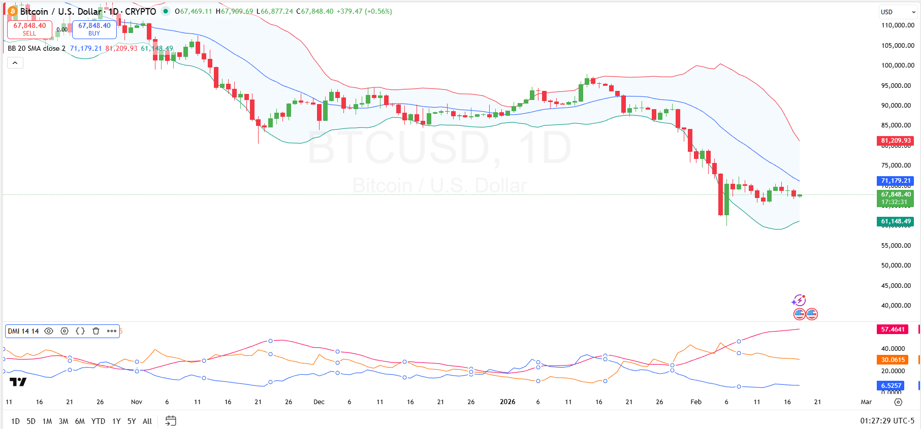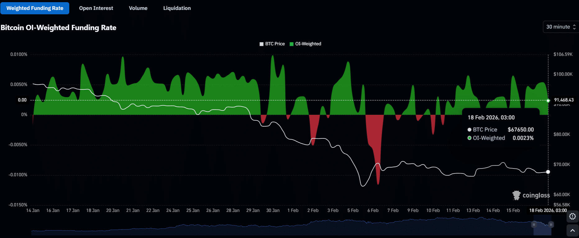 Additional chart data shows Bitcoin’s price action alongside its OI-Weighted Funding Rate, with Bitcoin priced above $67,000 as of February 18, 2026. The funding rate has been fluctuating throughout January and February, moving between positive and negative values, which indicates changing market sentiment. The OI-Weighted Funding Rate peaked at around 0.01% in early January before dropping to -0.01% in early February.