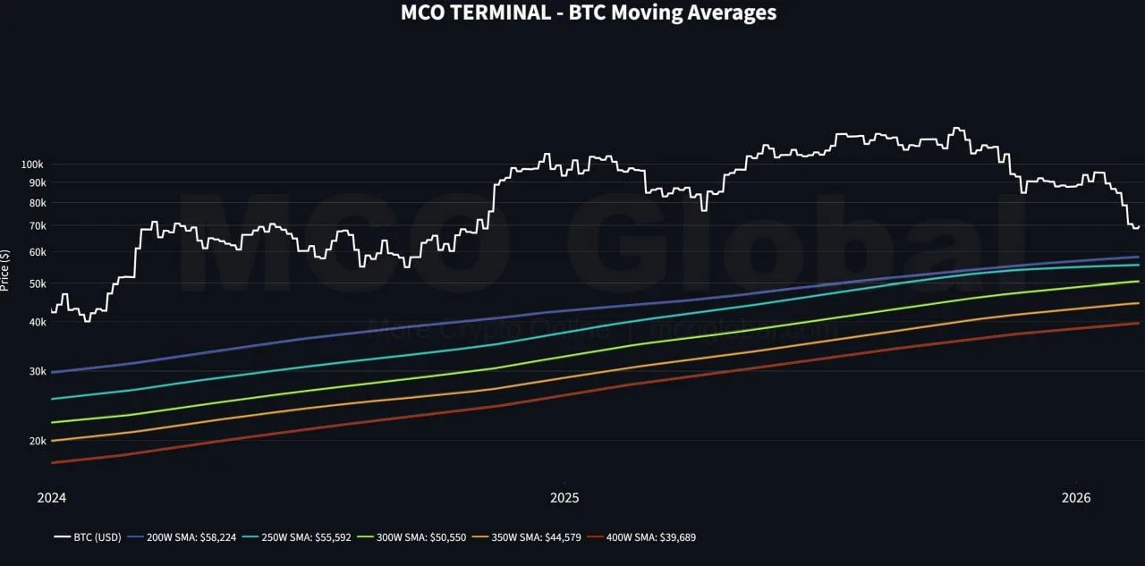 Bitcoin trades below its long-term trend lines as the 200-week simple moving average (SMA) comes into focus. The weekly $BTC chart shared by X user More Crypto Online shows price sliding toward the $58,224 200-week SMA. Meanwhile, Bitcoin also sits below the 250-week SMA near $55,592, the 300-week SMA near $50,550, the 350-week SMA near $44,579, and the 400-week SMA near $39,689. As a result, the market faces a test of longer-term support levels.
