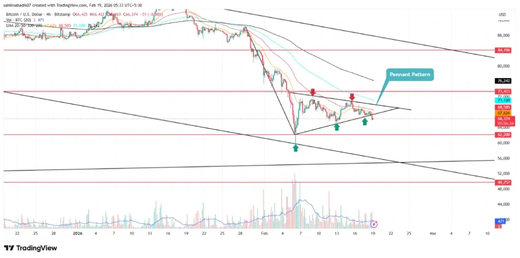 The crypto market slipped further on Wednesday, February 18th, as geopolitical tension and macroeconomic uncertainty triggered a risk off sentiment. The pioneer cryptocurrency, $BTC, plunged roughly 2% in the last 24-hours to currently trade at $66,238. The falling Bitcoin price sparks a bearish breakdown from the key support of the bearish pennant pattern, suggesting a risk of continued correction in the market. The declining network activity further accentuates that the coin price is far from establishing a stable bottom support.