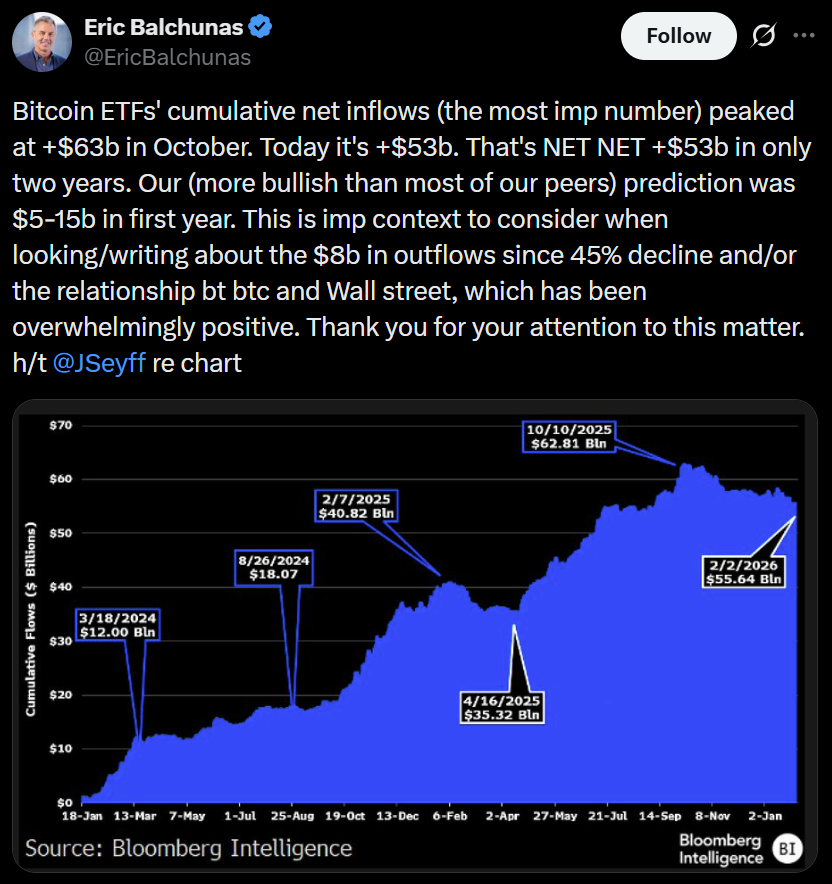 According to Bloomberg ETF analyst Eric Balchunas, cumulative net inflows into Bitcoin (BTC) ETFs peaked at $63 billion in October and now stand at about $53 billion, even after months of redemptions.