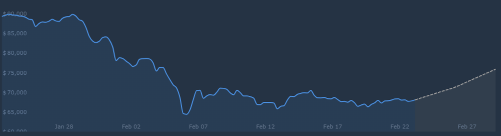 - Bitcoin is currently trading 11.38% below our prediction on Feb 27, 2026