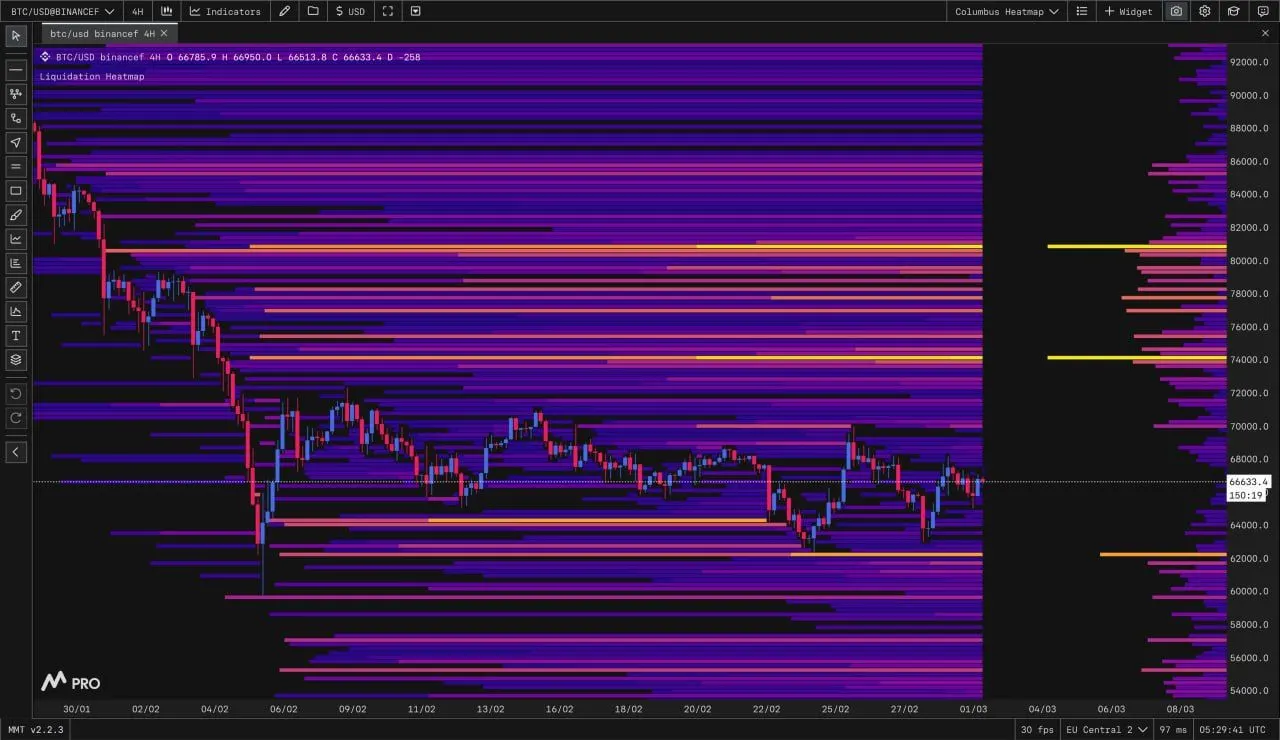Bitcoin hovered near $66,600 as traders assessed shifting liquidity levels highlighted by market commentator Columbus on X. In a Monday update, he pointed to fresh downside liquidity rebuilding around the $62,000 zone, according to the latest MMT heatmap data. The visualization showed dense liquidation clusters below current price, while overhead liquidity appeared more distributed across the mid $70,000 to low $80,000 range.