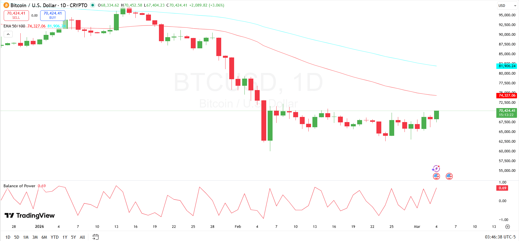 The daily chart shows Bitcoin attempting to reverse after a sharp correction that pushed the price briefly toward the $60,000–$62,000 region. Recent candles indicate a gradual recovery phase, with $BTC preparing to test the $70,000 area, suggesting improving short-term momentum. The Balance of Power indicator near 0.69 also signals that buyers currently hold a slight advantage, supporting the ongoing rebound.