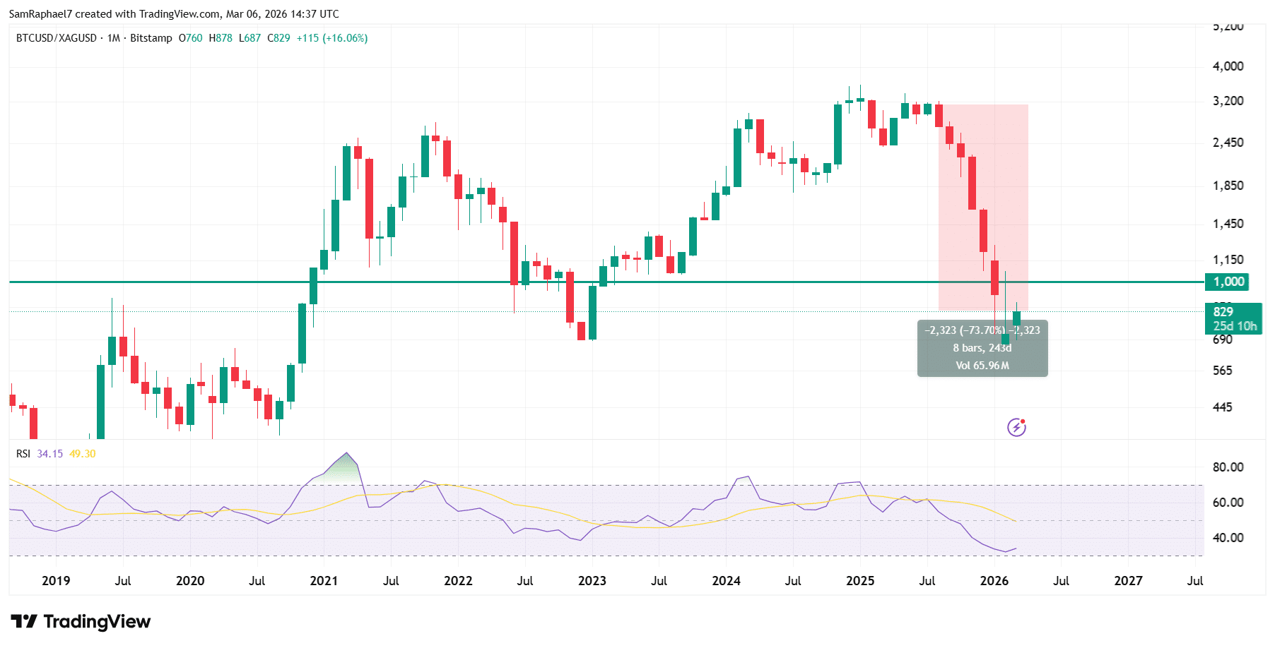 - Market data shows the $BTC/XAG ratio fell from 3,152 in August 2025 to 829 today, marking a 73.7% decline as silver outperformed Bitcoin.