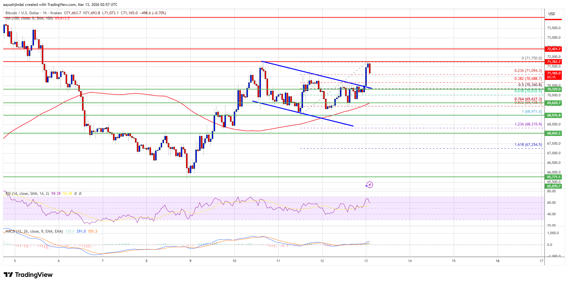 There was a break above a bullish flag with resistance at $70,500 on the hourly chart of the $BTC/USD pair. The pair even climbed above the $71,000 level. A high was formed at $71,750, and the pair is now consolidating gains near the 23.6% Fib retracement level of the recent upward move from the $68,971 swing low to the $71,750 high.