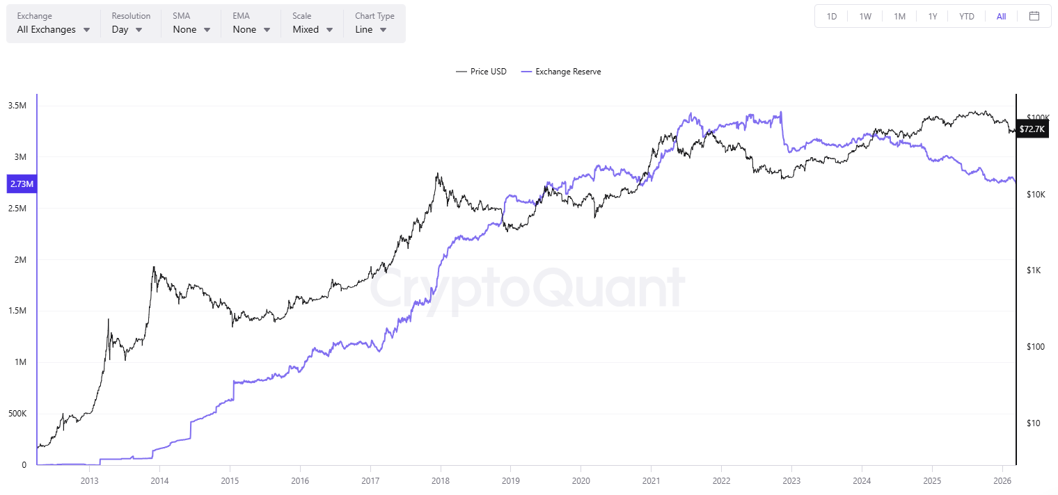 Next on the list is the gradually declining amount of coins sitting on crypto exchanges. According to CryptoQuant, the figure slipped to roughly 2.74 million today, the lowest level since the end of 2020. This development signals that investors have been moving their holdings toward self-custody methods and are in no rush to cash out.
