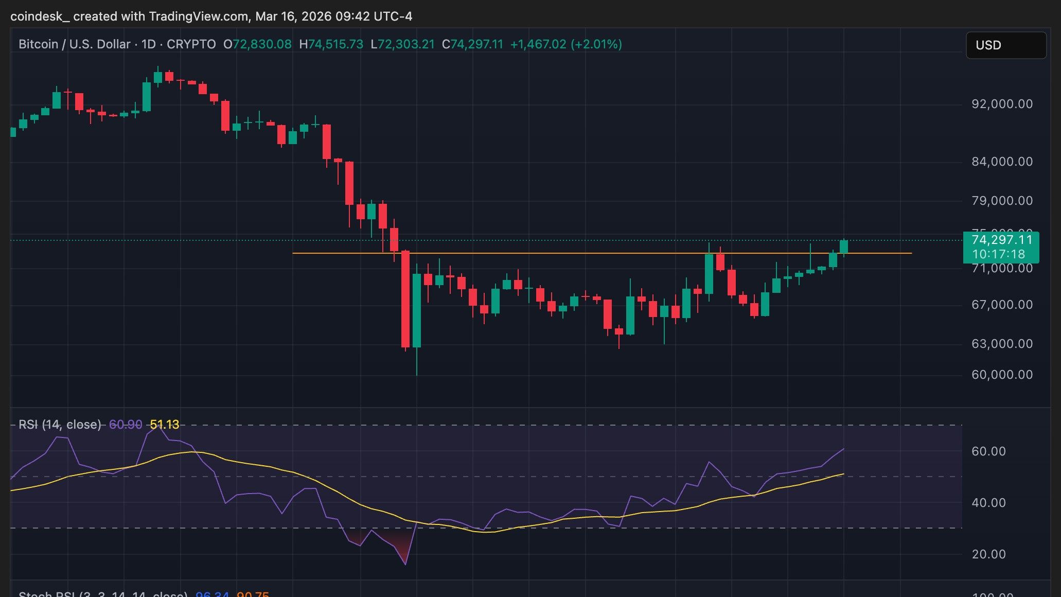 Cryptocurrencies started the week on a strong footing with bitcoin $BTC$74,244.92 surging above $74,000 and U.S. equities bounced as oil prices eased.
