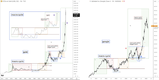 This reading becomes more interesting when placed beside gold and Alphabet. In both examples, price also advanced within a larger macro cycle, paused for a mid-cycle correction, and then resumed higher once that smaller reset was complete.