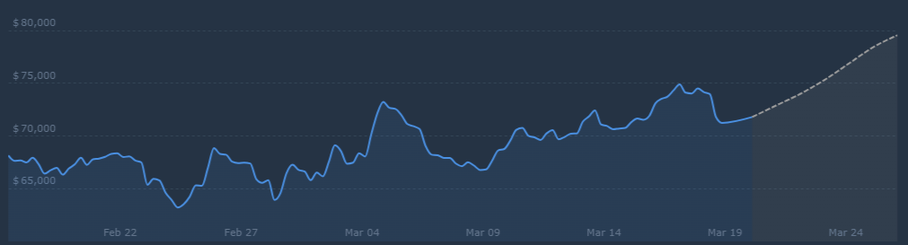 According to our Bitcoin price prediction, $BTC is expected to reach a price of $ 76,876 by Mar 24, 2026. This would represent a 8.14% price increase for $BTC in the next 5 days.