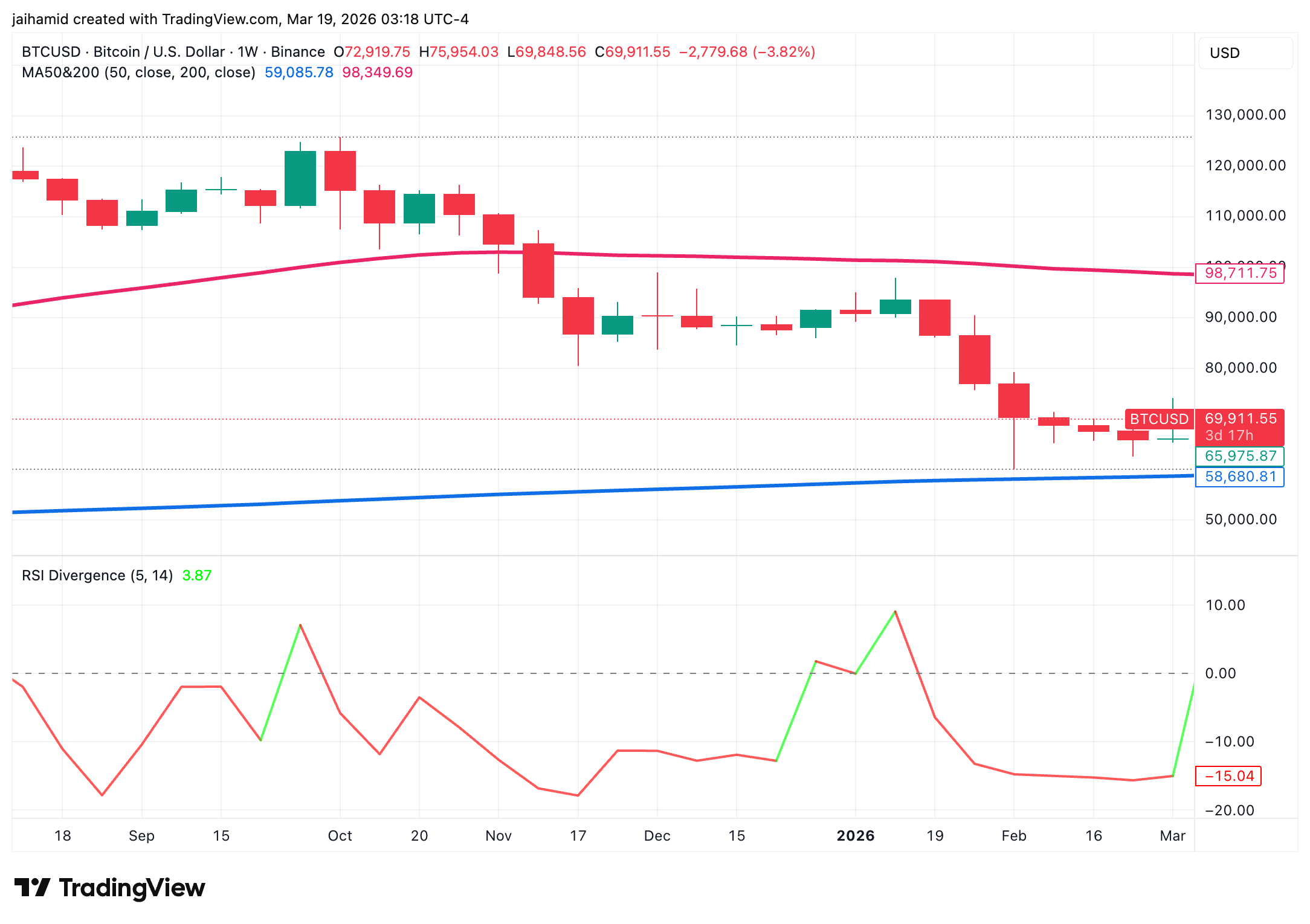 Price is now below $70,000. Put those pieces together and the higher-timeframe structure still leans bearish to neutral-bearish.