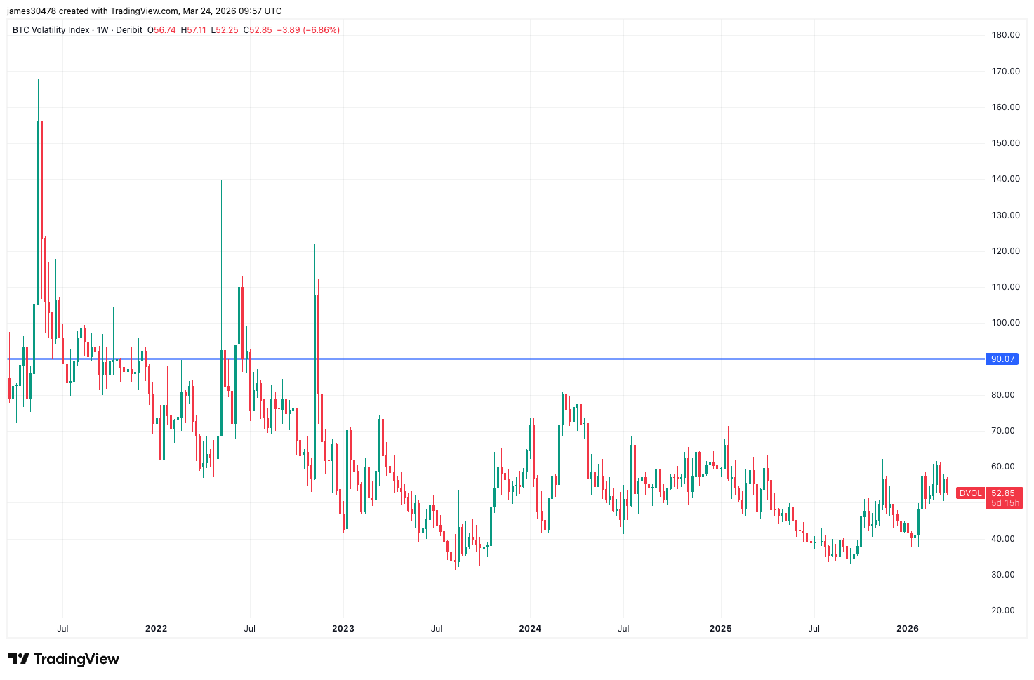 Speaking of the VIX, it reached a one-year high of 35% on March 9, nearly a month after the explosion in bitcoin volatility,. The VIX has been elevated throughout 2026 but has held below prior dislocation peaks above 60, seen during Liberation Day in April 2025.