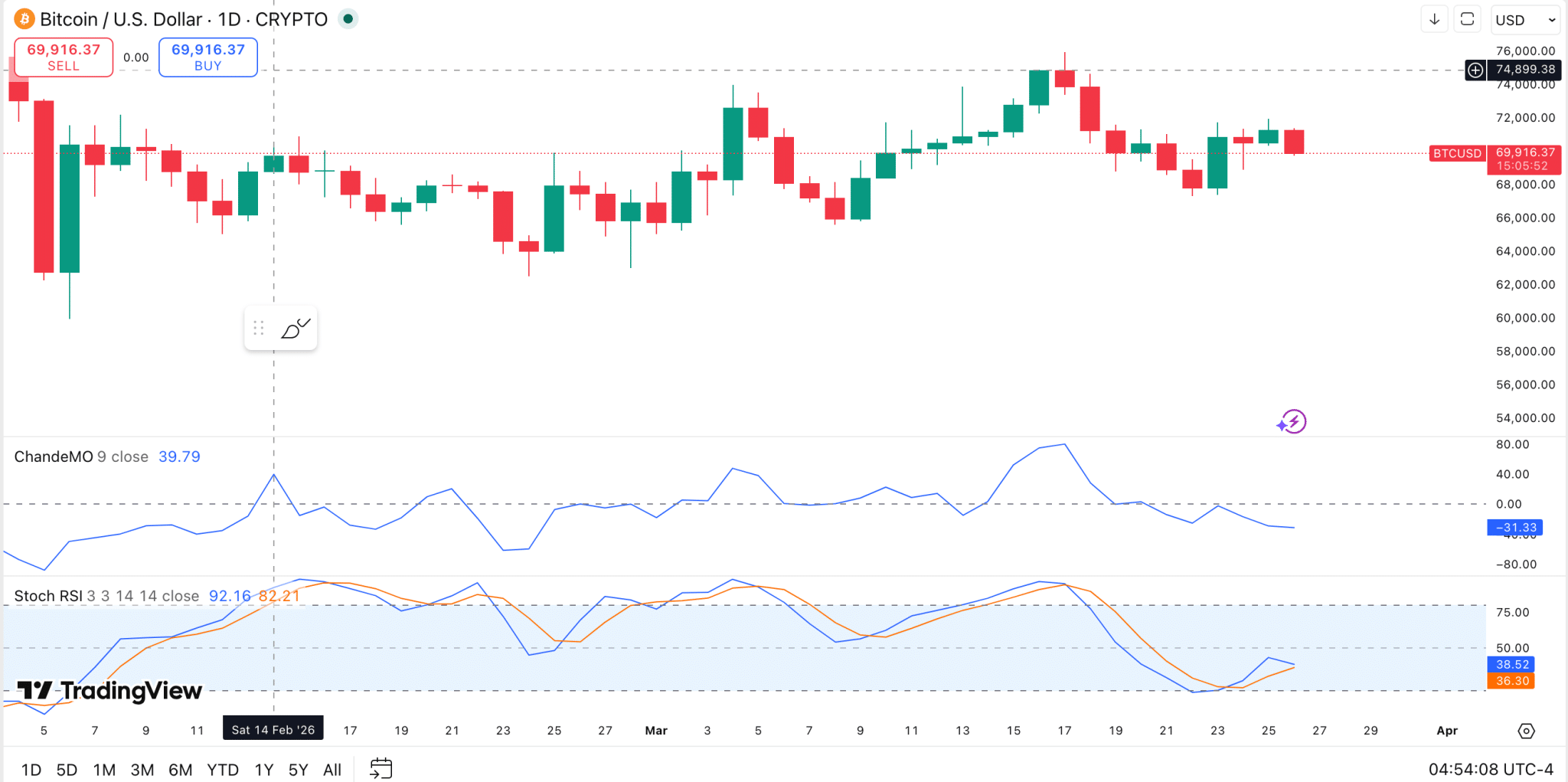The momentum indicators still lean cautious. The Chande Momentum Oscillator is sitting around negative 31.33, which signals that bearish momentum remains in control on the daily timeframe.