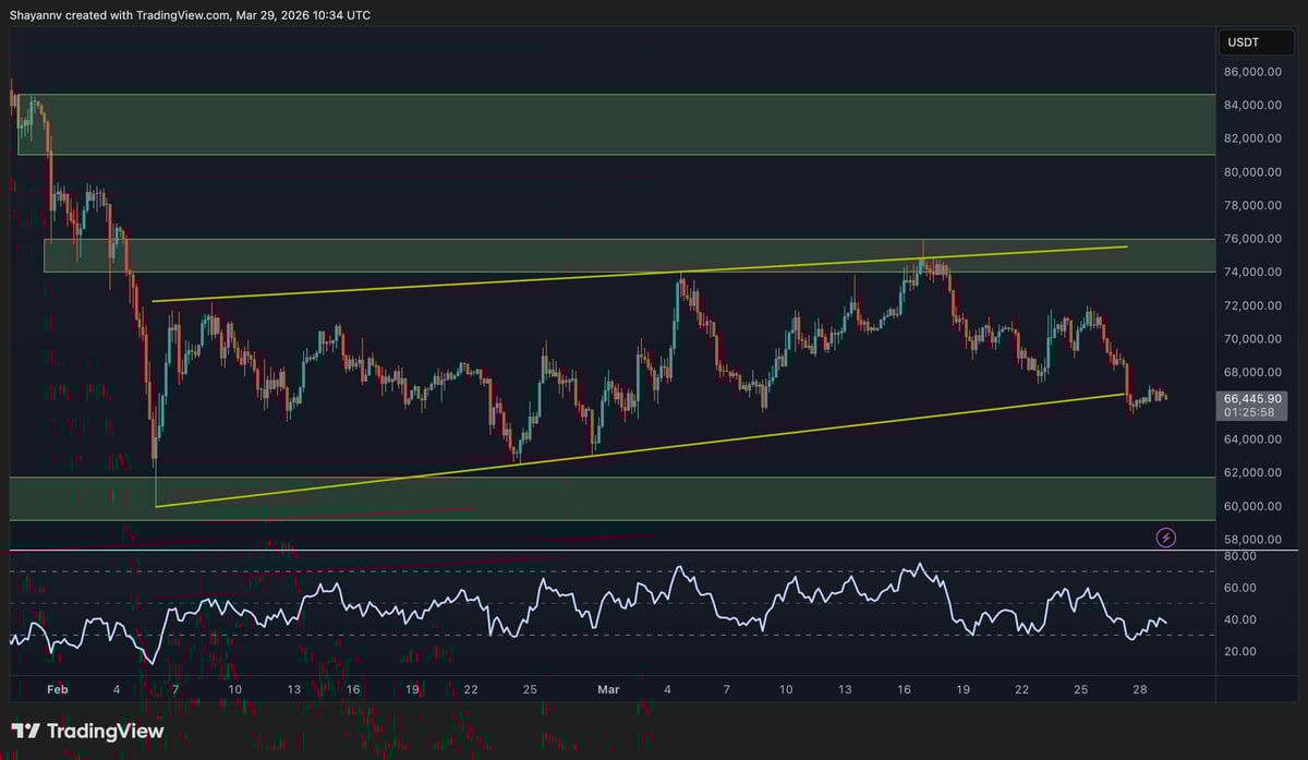 Dropping into the 4-hour chart, $BTC recently formed a bearish market shift after a rejection at the key $75k level and the upper boundary of the flag pattern. The short-term trend shows lower highs and lows, and the market is breaking below the lower trendline of the pattern at the moment.