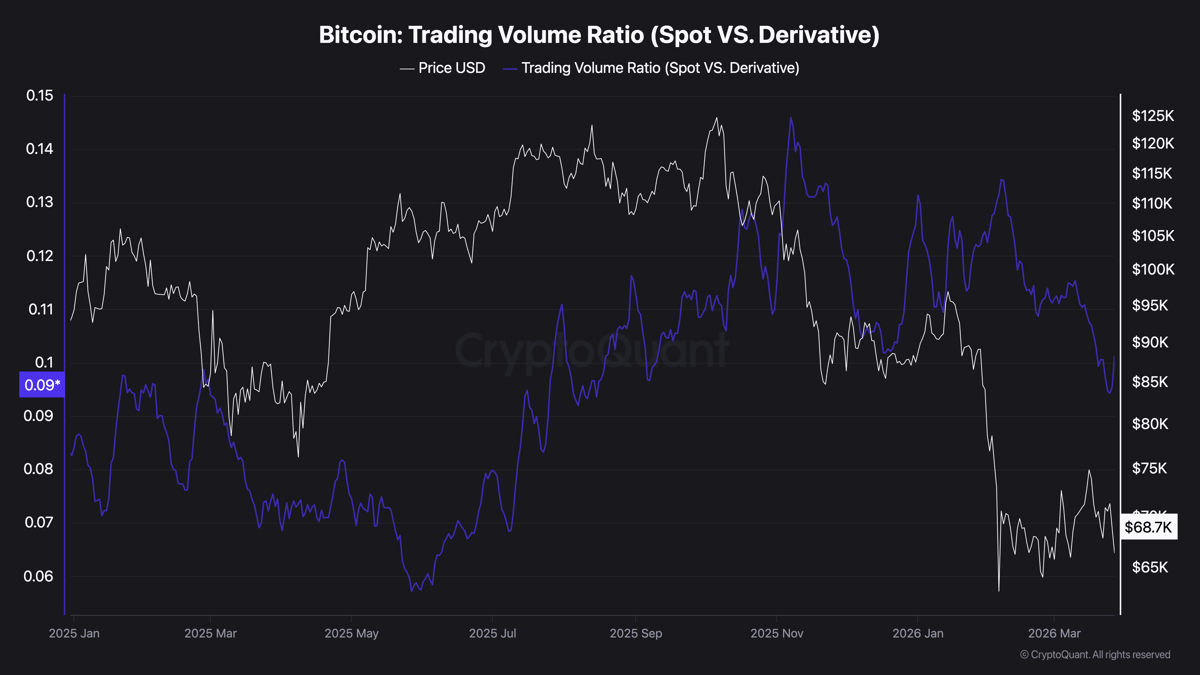 The $BTC spot-to-derivative trading volume ratio has recently declined. This indicates that trading activity has shifted toward derivatives rather than spot $BTC. It suggests that most participants are using leverage instead of buying or selling actual $BTC, which typically increases short-term volatility.