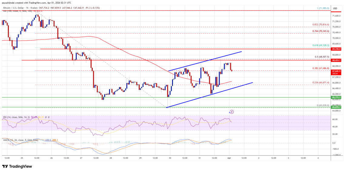 Bitcoin is now trading above $67,000 and the 100 hourly simple moving average. If the price remains stable above $67,000, it could attempt a fresh increase. Immediate resistance is near the $68,500 level or the 50% Fib retracement level of the downward move from the $71,986 swing high to the $65,030 low.