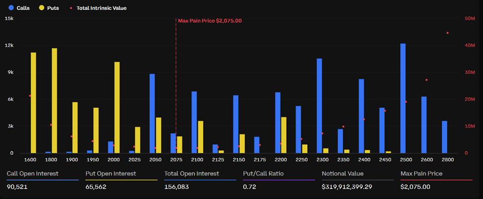 Ethereum’s expiry is smaller but similarly structured. With $319.9 million in notional value and 156,083 total contracts, $ETH trades at $2,052 against a max pain level of $2,075. Its put-to-call ratio of 0.72 points to heavier downside hedging than $BTC’s.
