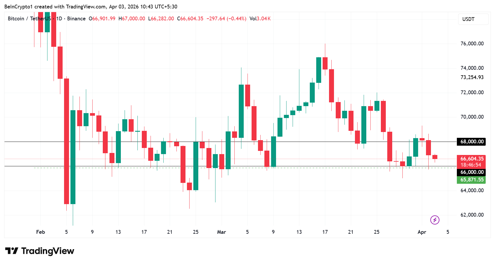 With $BTC trading at $66,575 and its max pain level set at $68,000, the spot price sits $1,425 below the level where options sellers profit most. If $BTC fails to close that gap before settlement at 08:00 UTC, the bearish whale’s puts gain value.