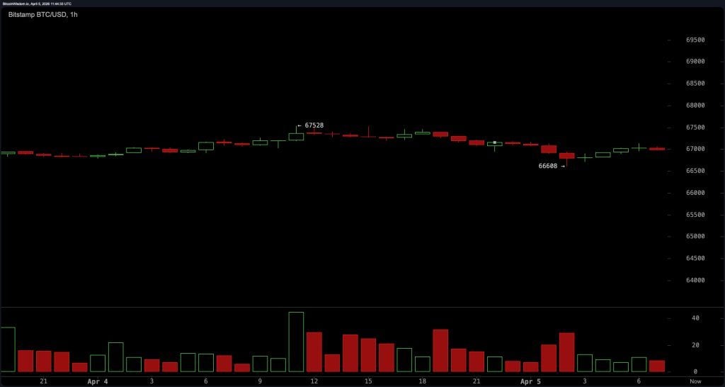 Bitcoin traded at $66,992 on April 5, 2026, with a market capitalization of $1.34 trillion and a 24-hour trading volume of $19.69 billion. The price moved within a narrow intraday range of $66,633 to $67,469, reflecting continued consolidation with no clear directional conviction.