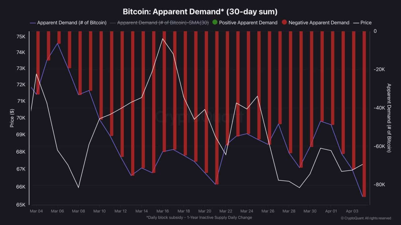 Bitcoin Apparent Demand, a key metric used to assess whether newly issued supply is being absorbed, suggests that April has opened on a weak footing. The metric measures the difference between Bitcoin issuance and the volume of coins that remain inactive for over one year.