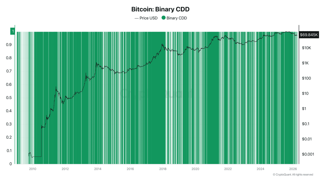 Data from CryptoQuant shows the Binary Coin Days Destroyed (CDD) has reached 1. When this metric prints 1, it signals that older coins are being moved, an event commonly associated with selling activity from long-term holders.