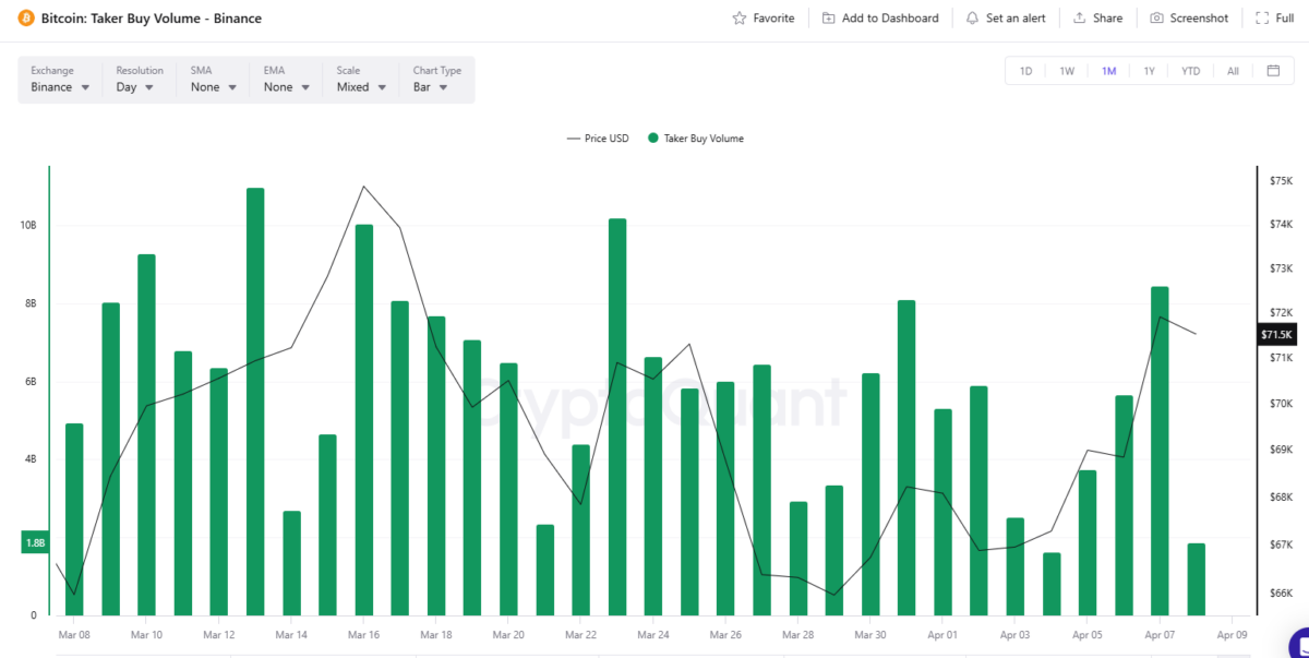 On Binance, cumulative net taker volume climbed to $1.02B, spiking to one of the highest levels in March after a week of low taker volume.