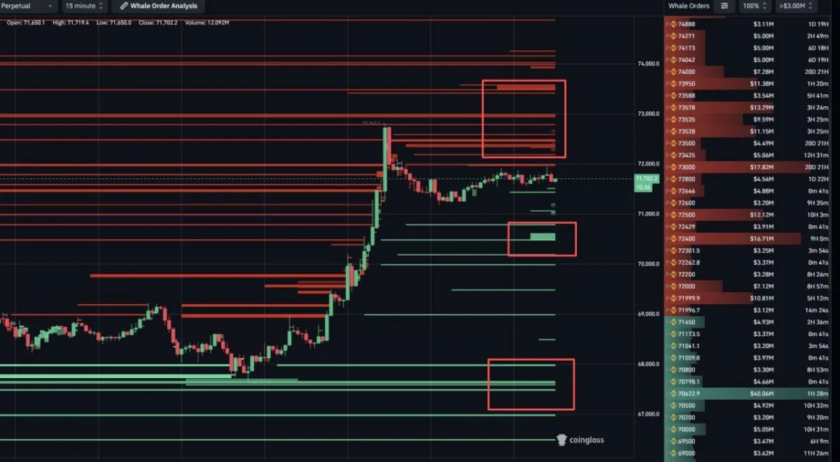 Bitcoin has moved into a pause after its latest push higher, and the latest CoinGlass whale orderbook snapshot helps explain why. The 15 minute chart shows heavy sell pressure stacked between $72,400 and $73,600, while the largest visible bid sits much lower near $70,600 with more than $40 million in support.