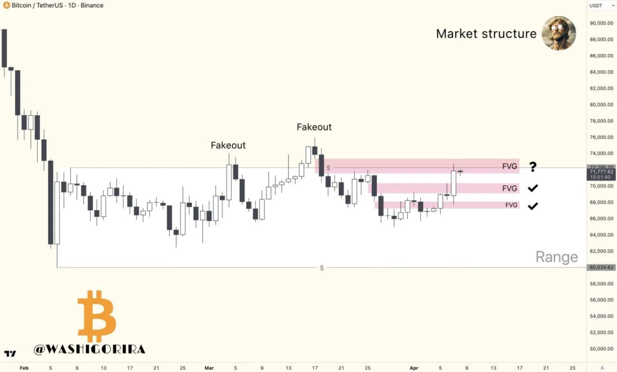 Bitcoin is making another push toward the top of its broader range, and this chart shows why traders are watching the move closely. According to Titan of Crypto, $BTC has already moved through the second fair value gap, or FVG, while only one overhead imbalance remains. That leaves price close to the last resistance zone before a possible breakout from the range.