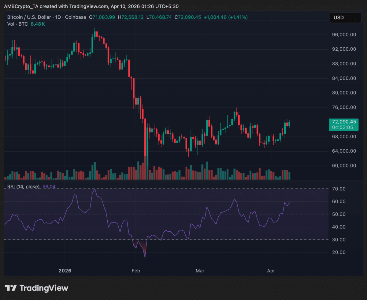 - Bitcoin is testing the upper end of its range near $72K, with momentum improving but no confirmed breakout yet.