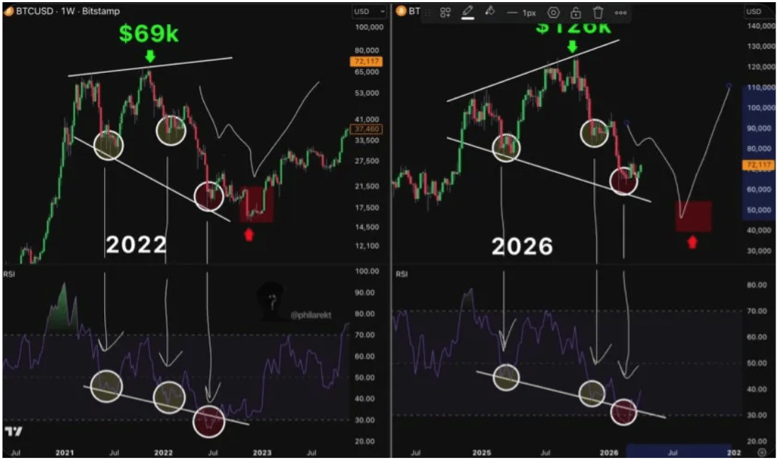 The current chart, with a cycle peak at $126,000 in October 2025, shows the same architecture forming in almost identical proportion. Both the 2022 and 2026 panels show Bitcoin respecting a slanted resistance line at the top while gradually falling within a downward channel. Each bounce fails to break out, and eventually the price has created successive lower lows.