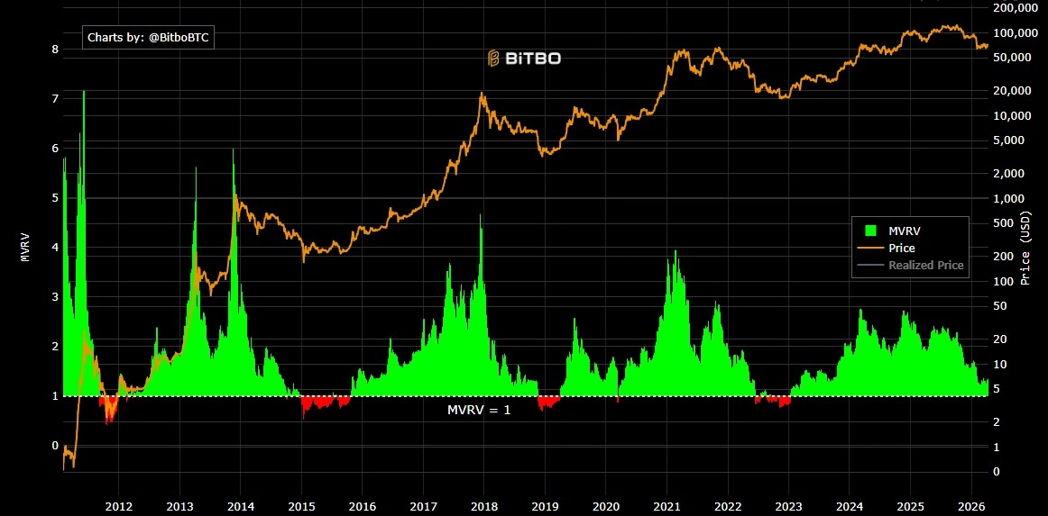 As the chart below shows, the MVRV has yet to turn negative, a level that has historically marked a price floor and preceded upward momentum. A realized price of $54,173 places the current MVRV at 1.35, whereas capitulation phases have historically aligned with MVRV values of 1.0 or below.