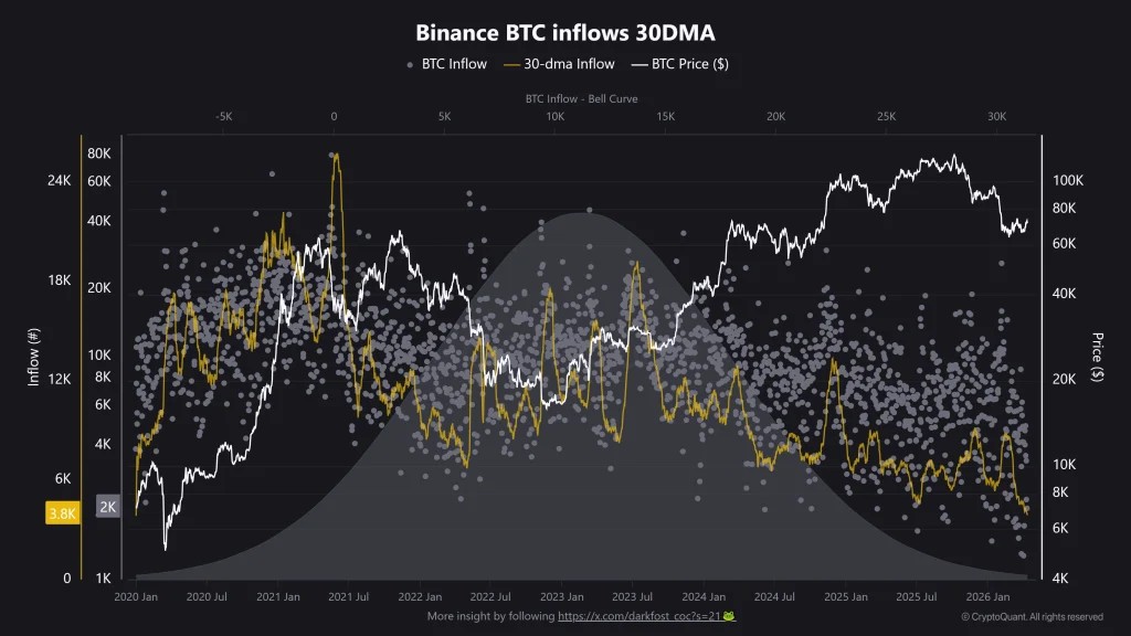 Exchange flows point to heightened accumulation at this time, with the 30-day average Bitcoin inflows on Binance dropping to 2020 lows.