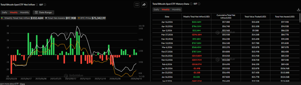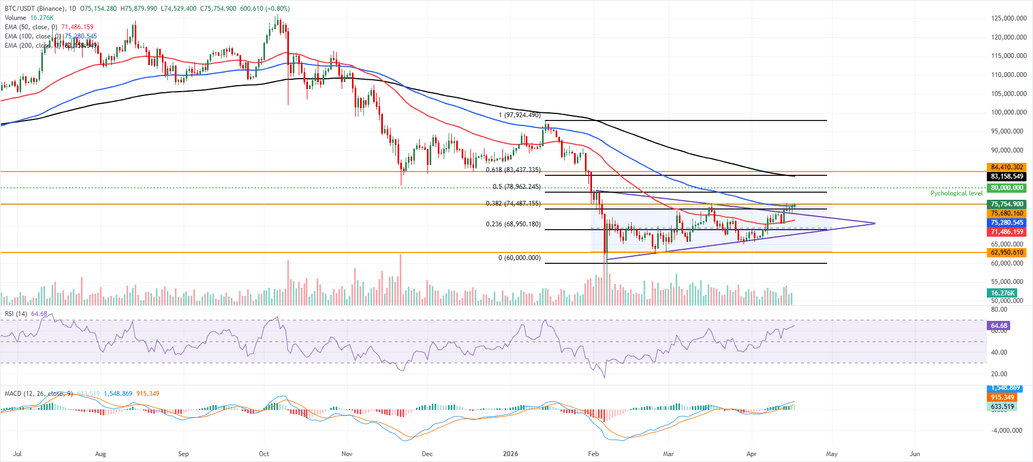 Bitcoin began the week on a positive note, as improving market sentiment due to developments in the Middle East supports risk assets. The largest cryptocurrency hit a two-month high of $76,038 on Tuesday. It then pulled back and steadied around $74,800 the next day.