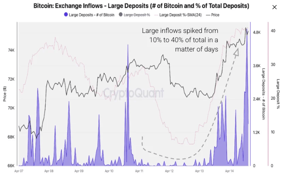 In addition, the chart below shows that the large deposits increased from less than 10% to more than 40% of total exchange inflows within days. This sharp rise indicates that institutional and large-holder distribution is driving the spike, which has historically coincided with elevated near-term selling pressure, something traders should be cautious of.